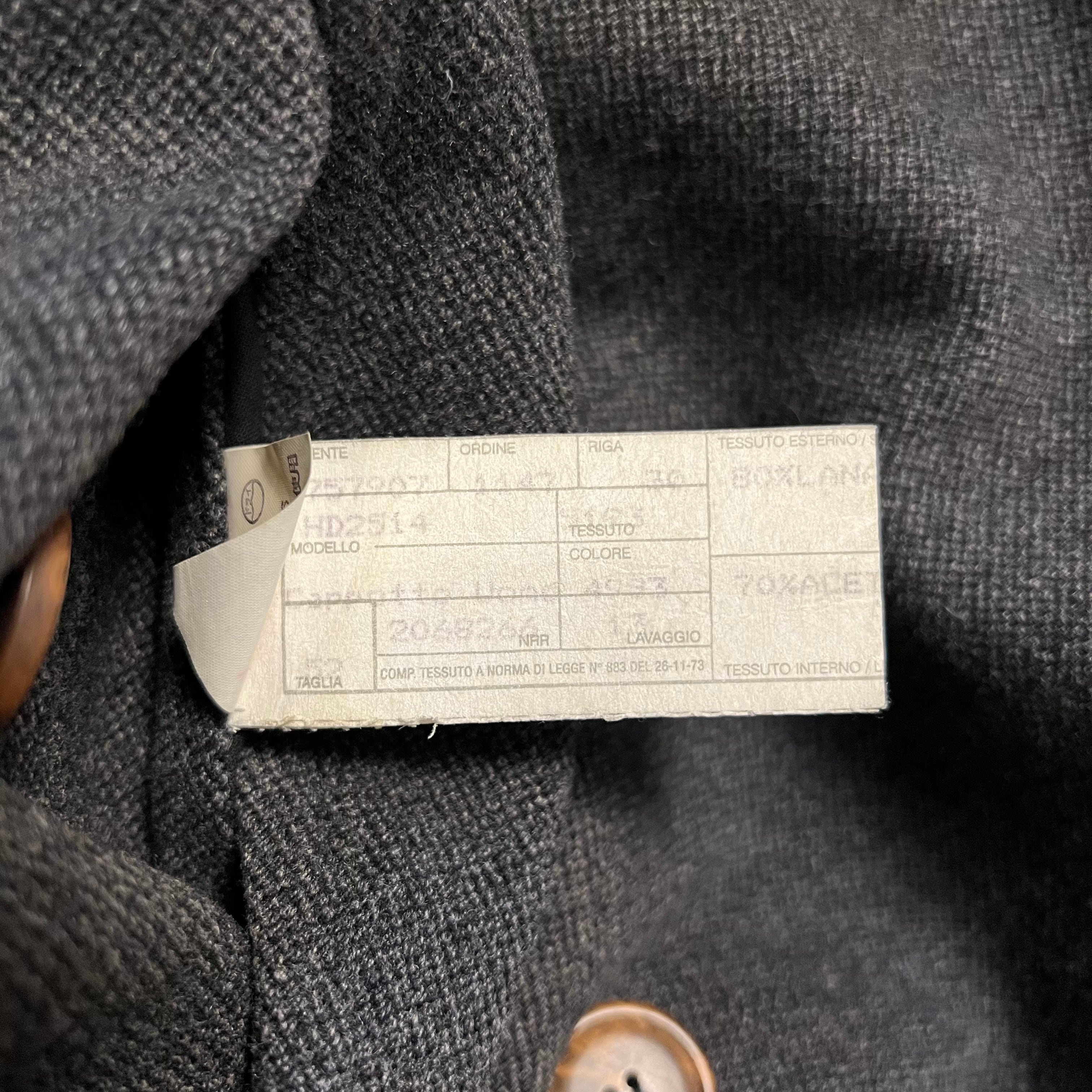 チャコールグレーの深い色調と、しっかりとしたウール素材が生む重厚な佇まいが印象的です。